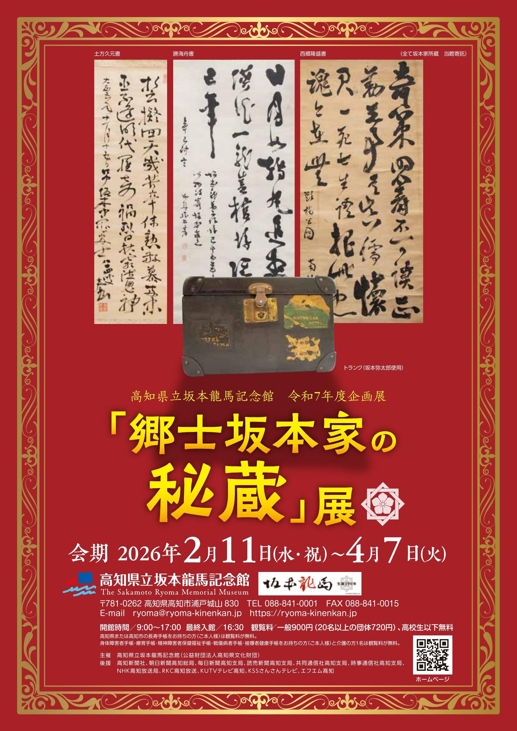 近世土佐の商家として知られる才谷屋。その才谷屋の分家・郷士坂本家の子として生まれた龍馬。坂本家は、明治31(1898)年に北海道へ移住しましたが、長年秘蔵されていた資料が坂本龍馬記念館に寄託されました。龍馬の遺品や、家族、同時代を生きた人々の書画、西郷隆盛、勝海舟などの資料など、県内初展示となる資料をはじめ、由来や逸話なども紹介します。記念講演会や学芸員による展示解説も開催します。※詳しくは、チラシ・公式サイトをご覧ください。