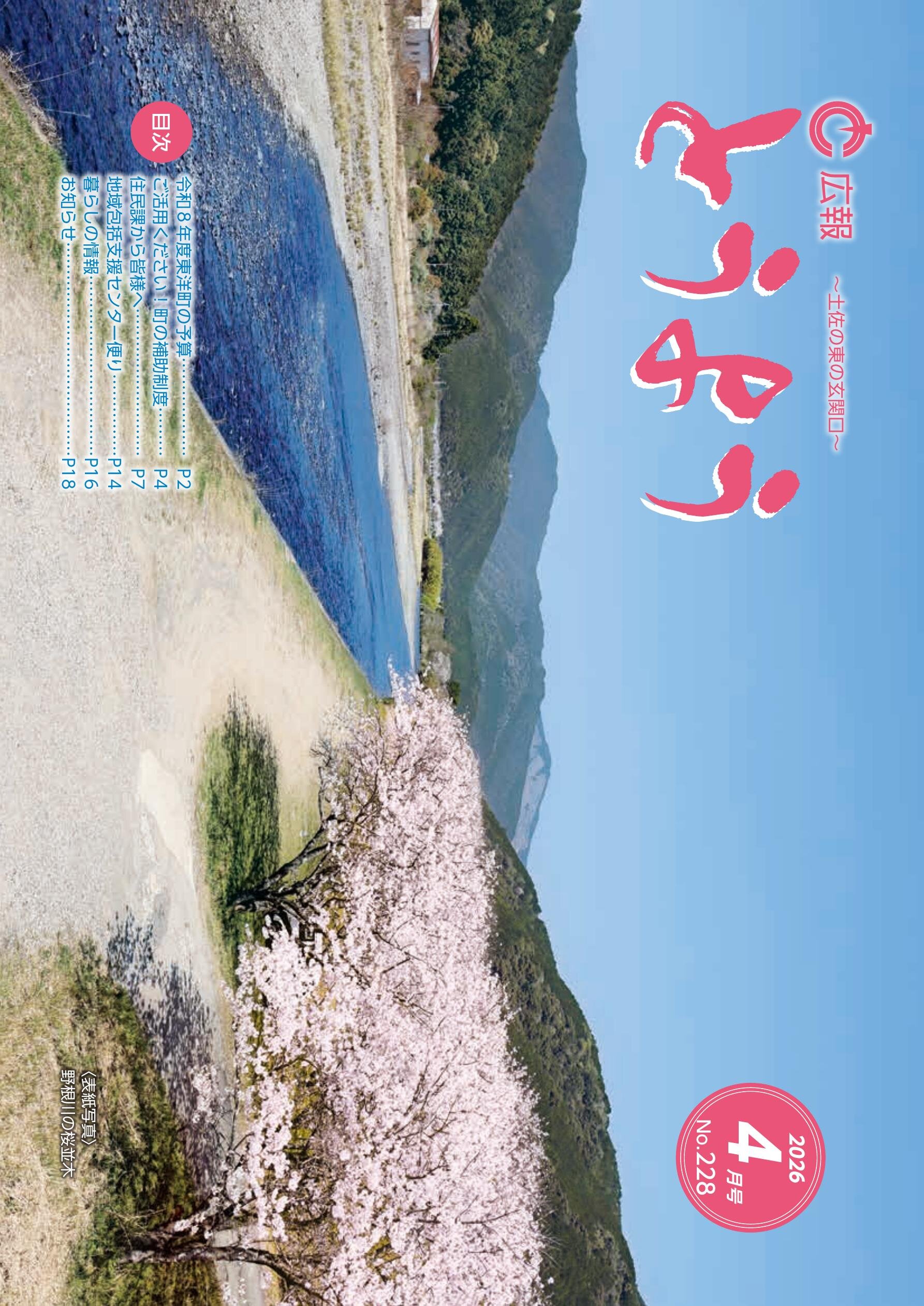 【表紙】野根川の桜並木 ■令和8年度東洋町の予算 ■ご活用ください!町の補助制度 ■住民課から皆様へ ・東洋町こど