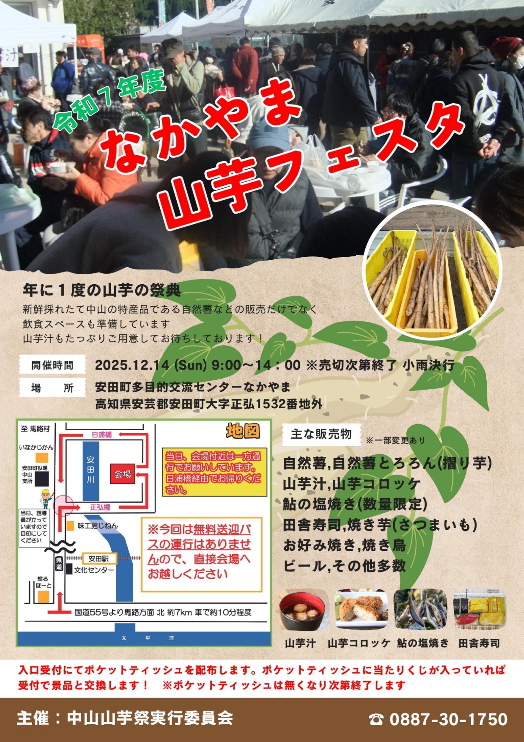年に1度の山芋の祭典! 新鮮採れたて中山の特産品、自然薯を始め、山芋汁や山芋コロッケ、鮎の塩焼き(数量限定)、田舎寿司等